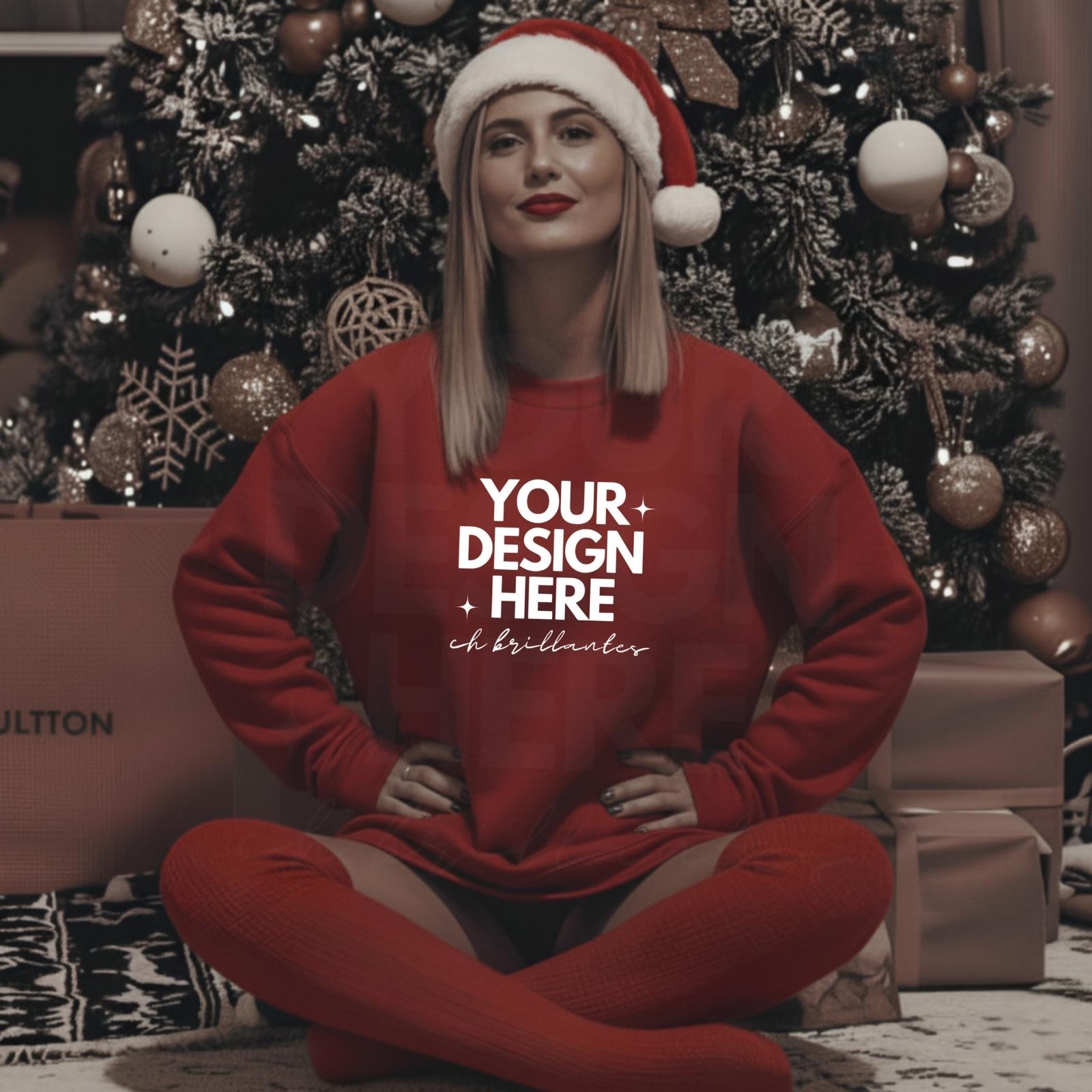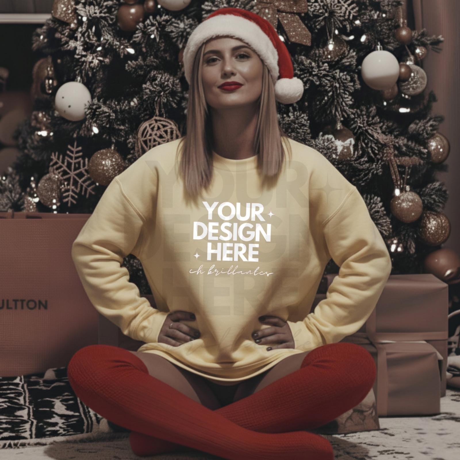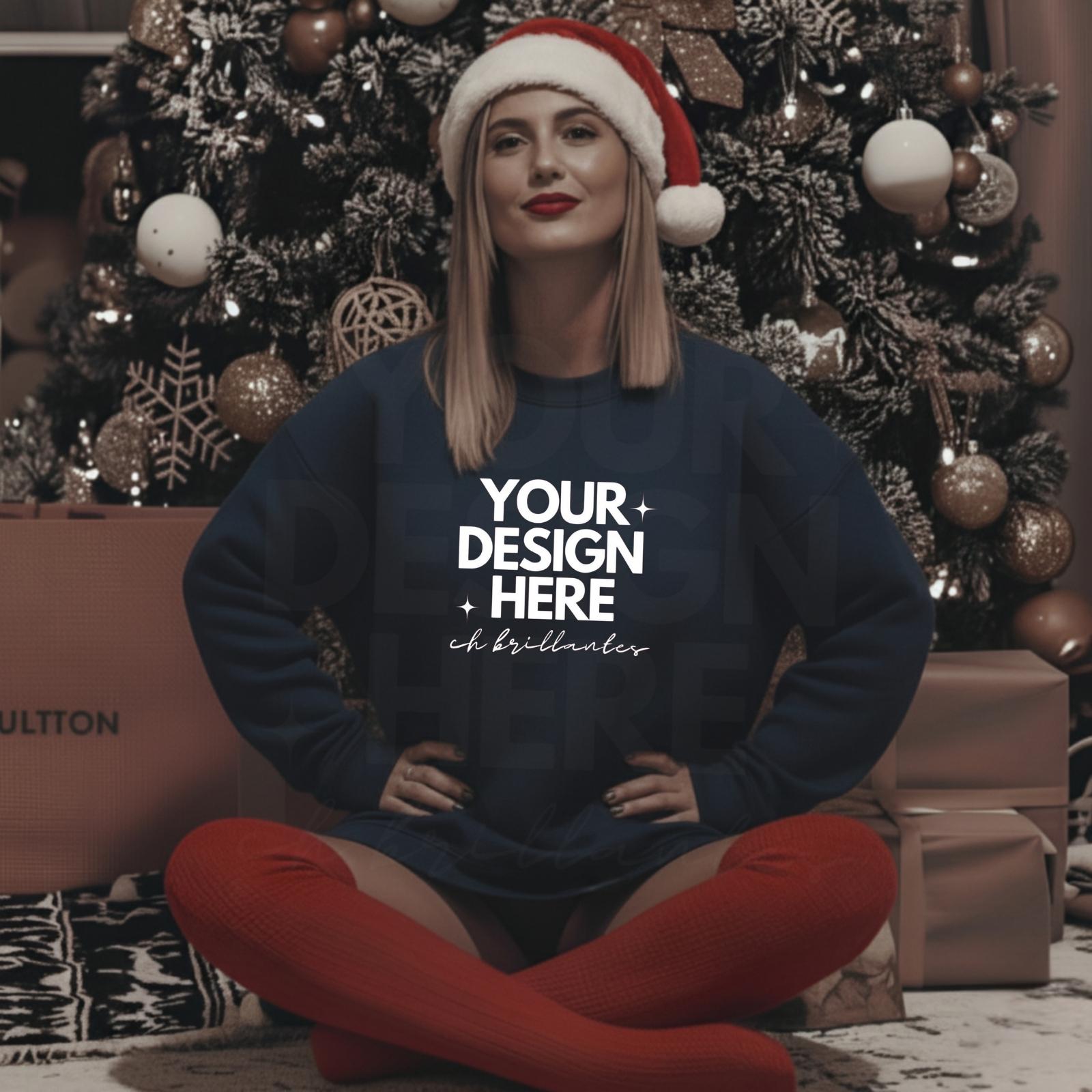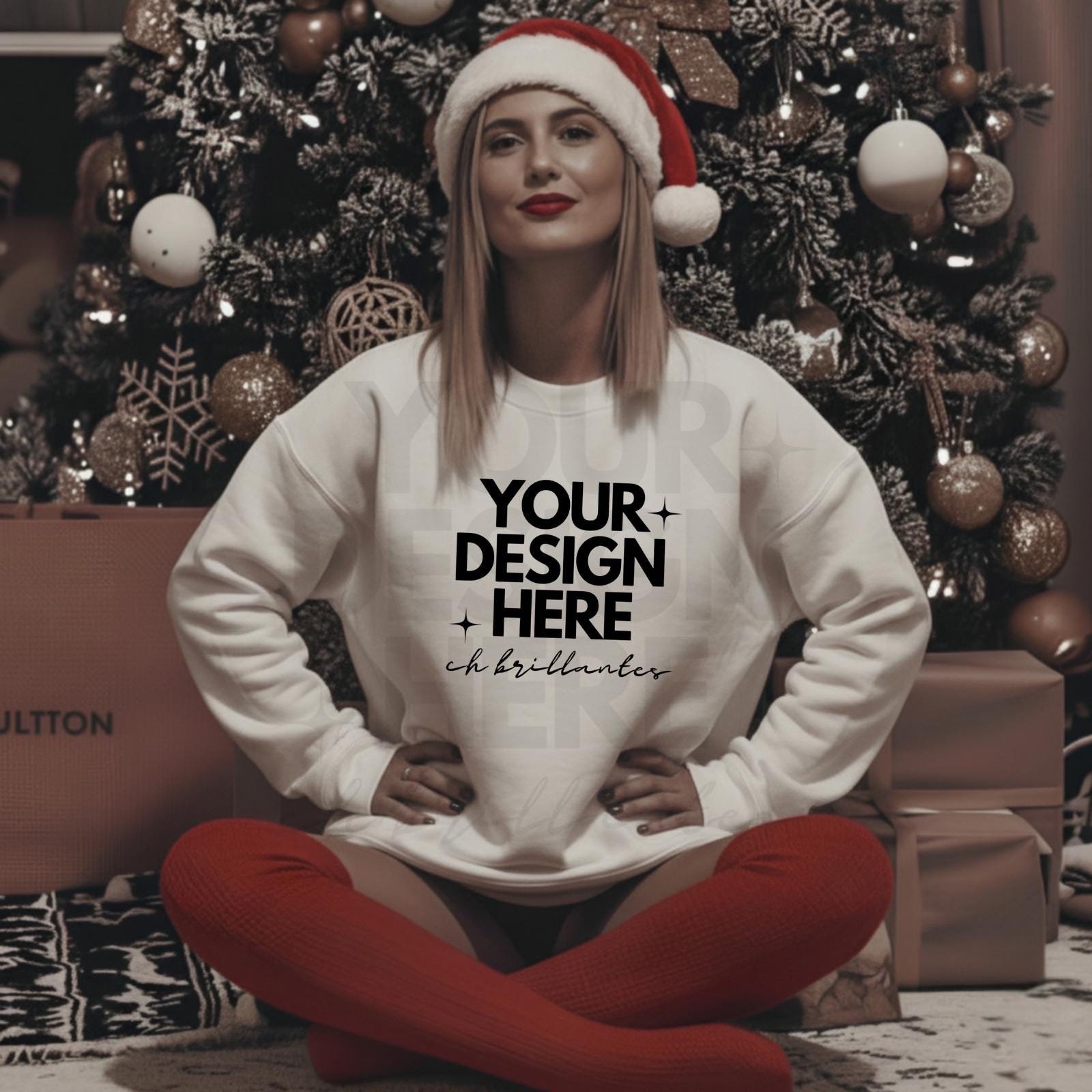 ✅ Your design applied to the Gildan 18000 Heavy Blend Sweatshirt by our model wearing a Santa hat.